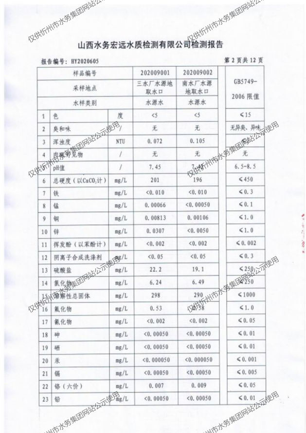 忻州城區公共供水水源水、出廠水、管網水、管網末梢水2020年9月份水質信息公示
