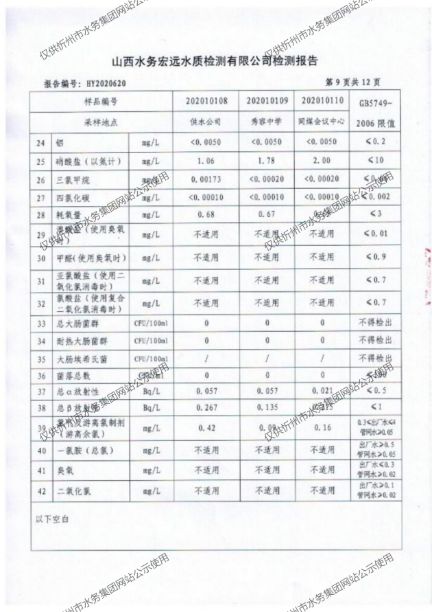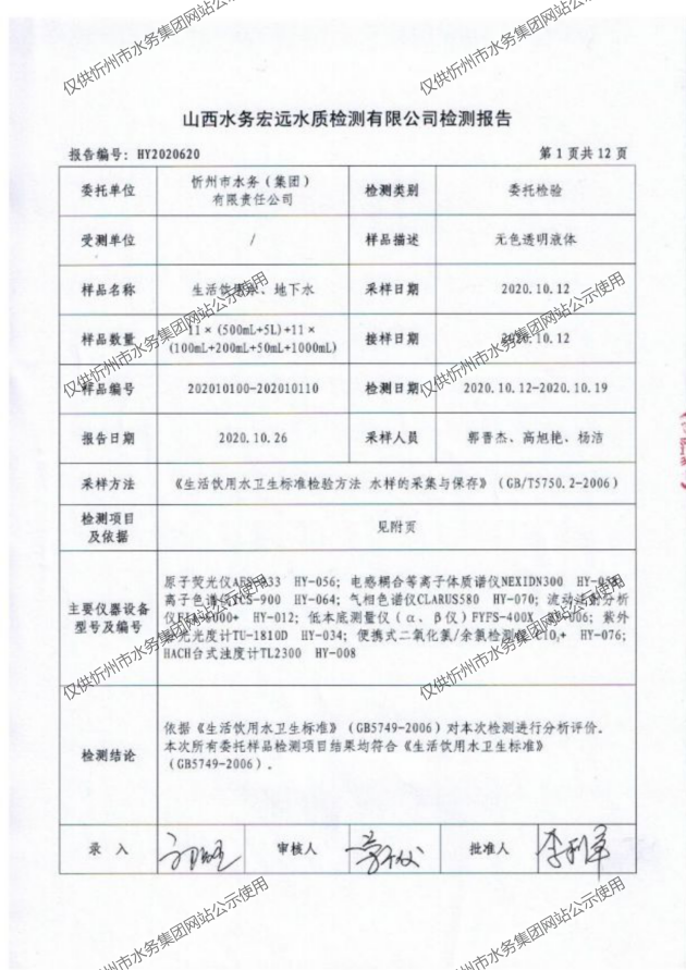忻州城區公共供水水源水、出廠水、管網水、管網末梢水2020年10月份水質信息公示