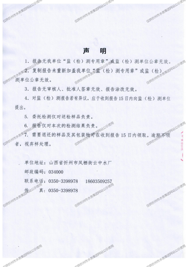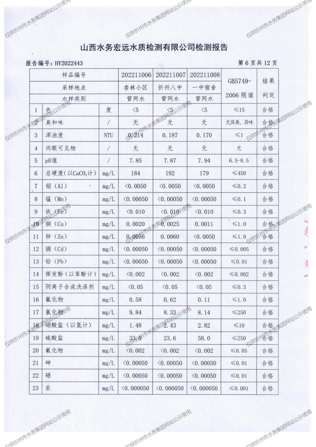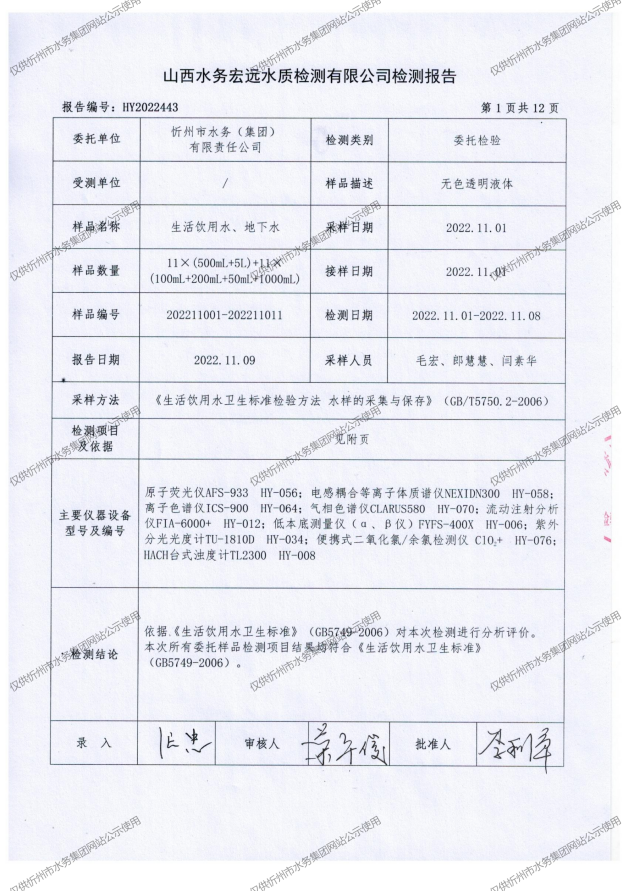 忻州城區公共供水水源水、出廠水、管網水、管網末梢水2022年11月份水質信息公示