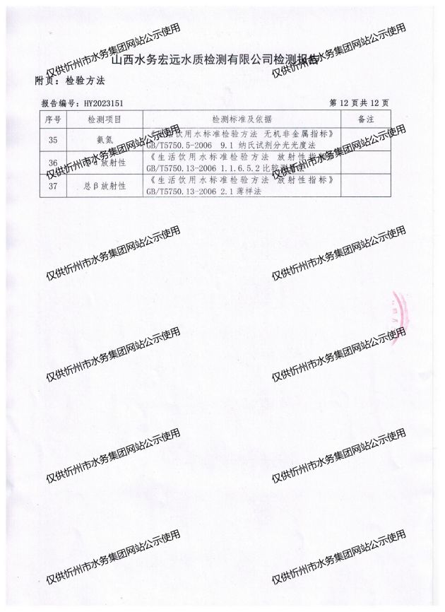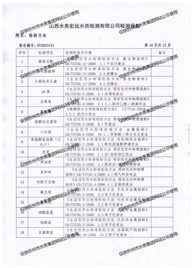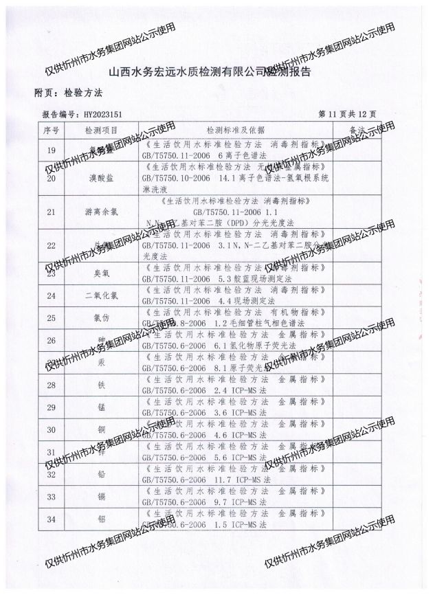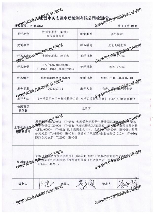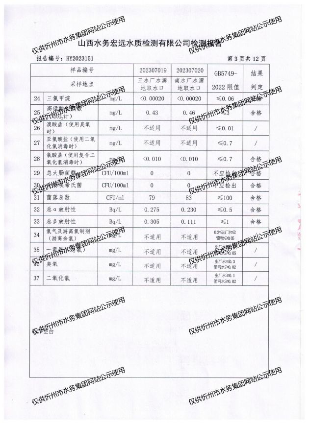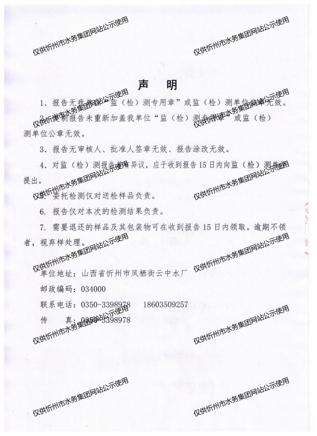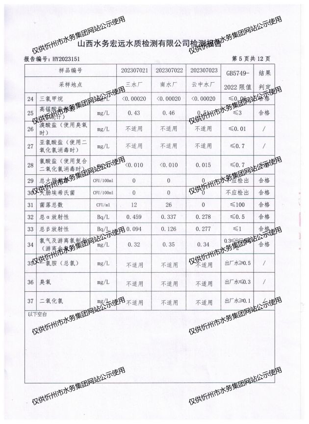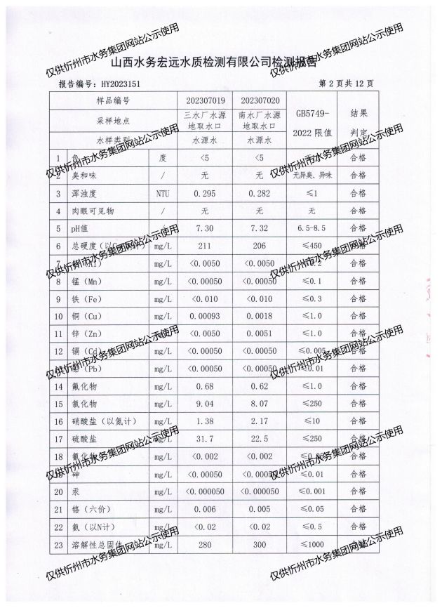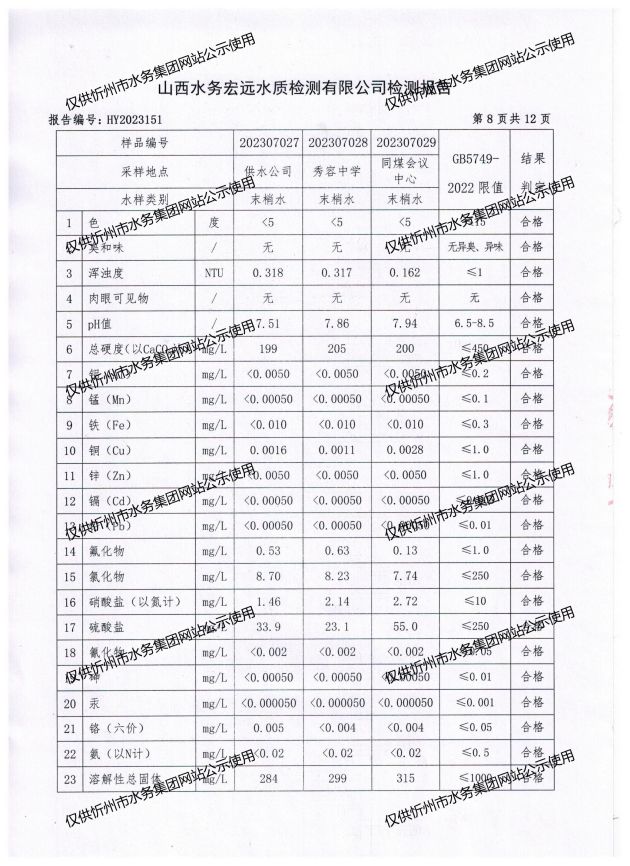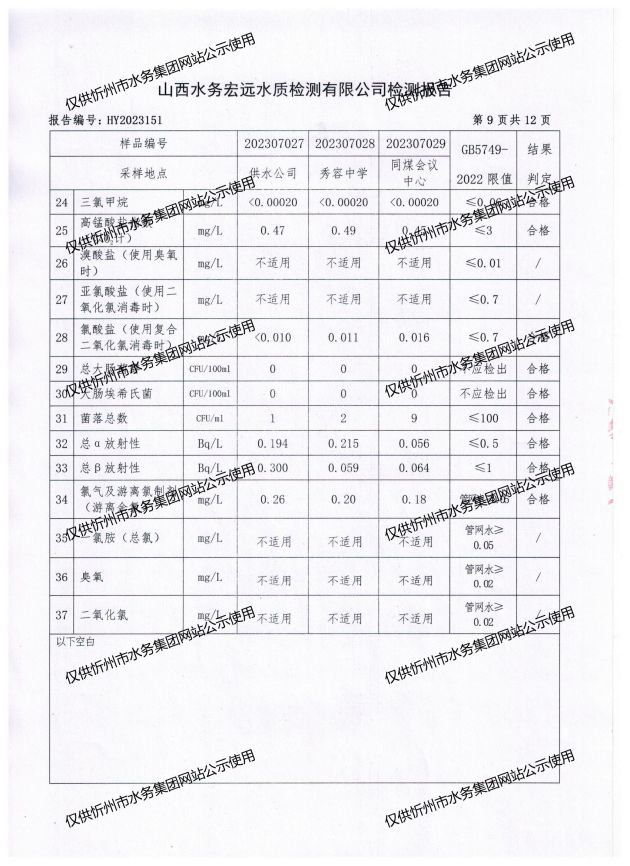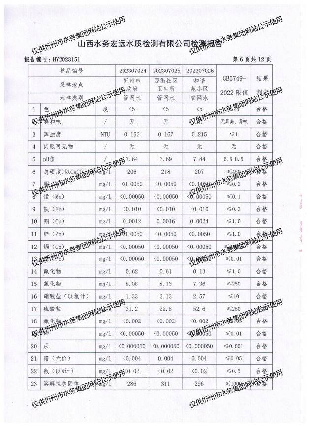 忻州城區(qū)公共供水水源水、出廠水、管網(wǎng)水、管網(wǎng)末梢水2023年7月份水質信息公示