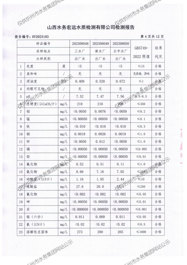 忻州城區公共供水水源水、出廠水、管網水、管網末梢水2023年8月份水質信息公示